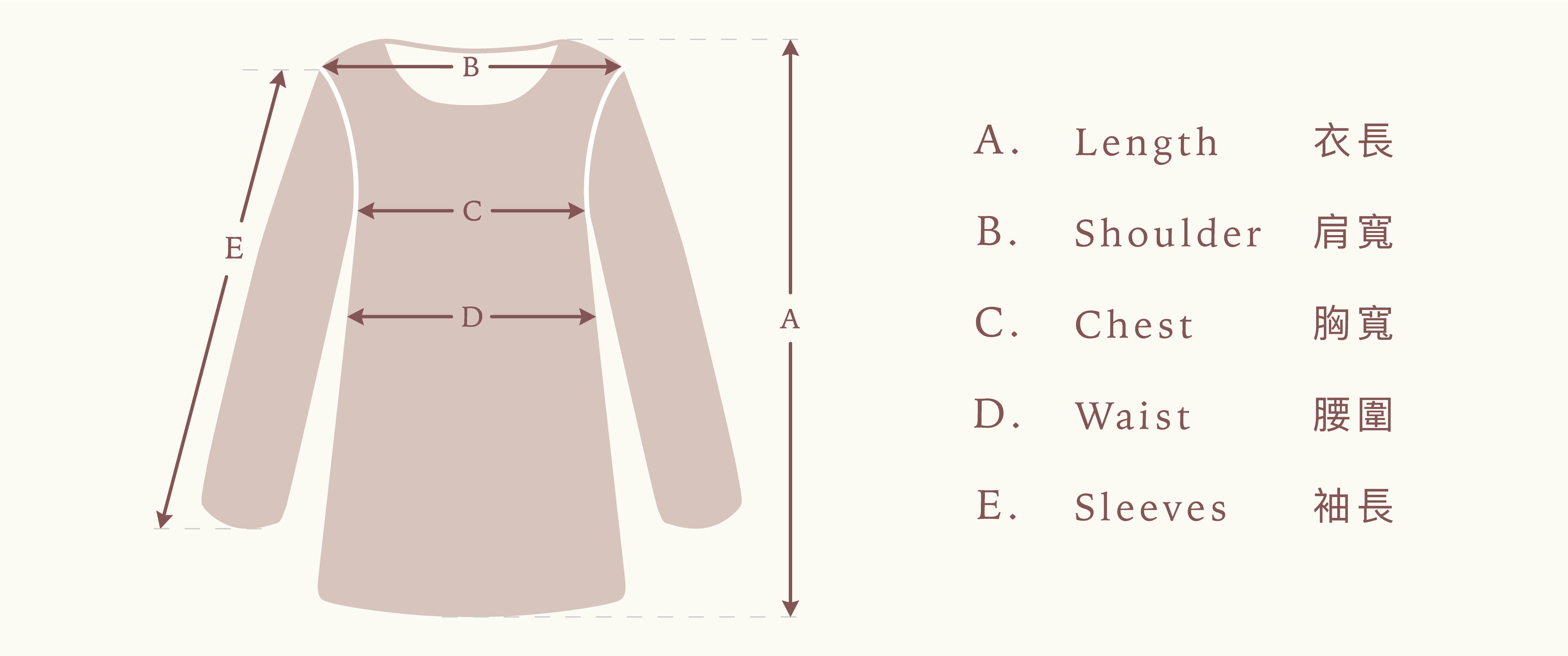 Shoulder Width 28cm | Chest 86-96cm ( 34-38") | Waist 76cm (30") | Hip 101cm (40") | Length 75cm | Sleeves 60cm
